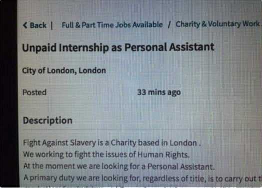 Basically such a headline tells you everything that is wrong with the modern world. I'm wondering if "Fight Against Slavery Group Advertises for Unpaid Internship" was a publicity stunt. If it was, they clearly didn't follow up on it. Why else would you look for an unpaid internship rather than search for a volunteer?